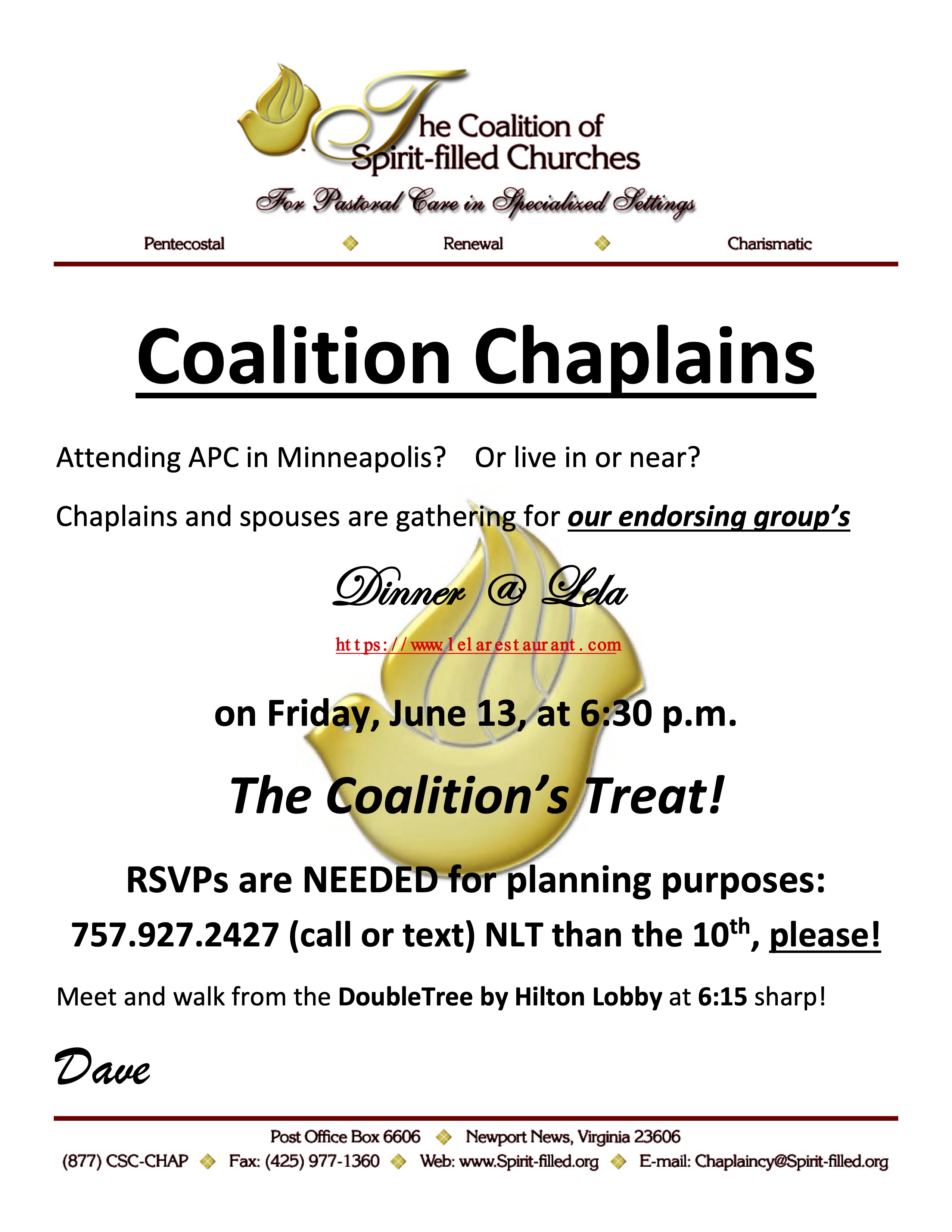 With the repeal of DADT two years ago and then the recent ruling against DOMA and California’s Proposition 8 by the US Supreme Court, we have recently been contacted by a growing number of chaplains for guidance on what to do when they are asked to do weddings, conduct retreats, offer various liturgical services, etc., when Lesbians, Gays, Bisexuals, and Transgendered (LGBT) military members or their loved ones are involved. The response to those requests have been on The Coalition of Spirit-filled Churches' website for almost two years, but you have to know where to look. We seek to make it clearer with this new button and accompanying page. We are not a denomination. As such, apart from a very basic statement of neo-Pentecostal faith (or an openness to the same), we do not get into denominational, our groups', or even a single congregation's doctrine, tradition, culture, politics, or policies and practices. We are not legally configured to dictate or impose various policies on our member churches — or their chaplains. Thus, we simply state that you need to follow the doctrine and practice of your ordaining body — which is formally affiliated with us. (See "2011 CSC Policy on Political Statements and Endorsing Agency Policies" on https://www.spirit-filled.org/chapnews.html.) So basically whatever your ordaining community accepts or directs, as members of The Coalition, we will accept. The other piece here is that we do not want you to violate your conscience, either. If you feel you are being pressured to do so, we need to hear about it. We WILL support you as you are following the expectations of your ordaining church. Last, we expect you to be respectful of and show care and genuine empathy to ALL who approach you for ministry. If you cannot perform a service that you are being asked to do, that is okay, but we expect you to refer that person or couple or family to another chaplain or clergy who can. If chaplains are not approachable, they have very limited usefulness to the very people — or institution — to whom they are charged with serving. We hope this is helpful and makes sense. We welcome dialog on this topic or anything. Blessings, |