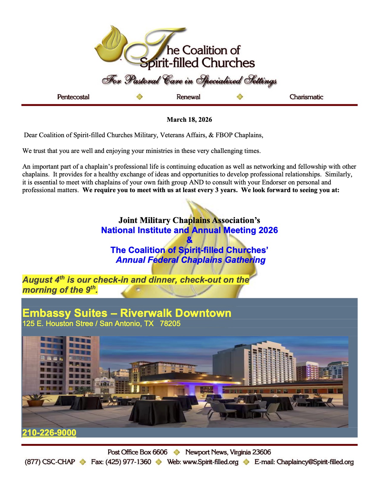 The Department of Defense is to be commended, in my opinion, for updating its listing and seeking to honor its commitment to serve all. The memorandum may be found here. The Coalition of Spirit-filled Churches expects all of its chaplains to be willing and able to comply with this DoD memorandum and to assist, as best they can in a respectful and dignified manner, all who seek their assistance to worship in the manner they are accustomed or to gather for like-minded gatherers to observe their religion/worldview. | |
